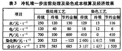 (2)陳勝慧等[8]通過(guò)實(shí)際的成本核算發(fā)現(xiàn),冷軋堆染色工藝生產(chǎn)1t產(chǎn)品所耗的水量?jī)H約傳統(tǒng)工藝的10%,見(jiàn)表3。