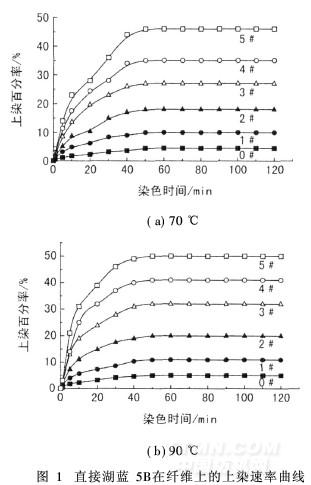 圖1是直接湖藍(lán)5B在PAMAM改性海藻酸鈣纖維上的上染速率曲線。