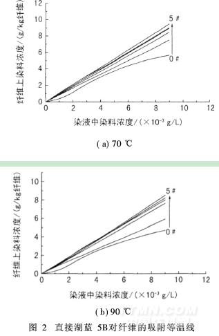 由圖2可以看出,直接染料湖藍(lán)5B對海藻酸鈣纖維的吸附等溫線屬于弗萊因德利胥(Freundlich)類型,