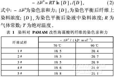 AM改性海藻酸鈣纖維的染色熵為正值,說明直接染料湖藍5B對PAMAM改性海藻酸鈣纖維的親和力很好,直接染料可以用于PAMAM改性海藻酸鈣纖維的染色,實現海藻酸鈣纖維的無鹽染色。