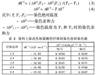 染色熱是每摩爾染料從染液轉移到纖維上所吸收的熱量,標志著上染過程中各種分子間的作用所產生的能量變化,其計算采用式(3);染色熵是每摩爾染料從染液轉移到纖維上所引起的物系熵變,其計算采用式(4)[22]。根據式(3)和(4)可計算出直接染料湖藍5B上染PAMAM改性海藻酸鈣纖維的染色熱(ΔH°)和染色熵(ΔS°),所得結果見表2。