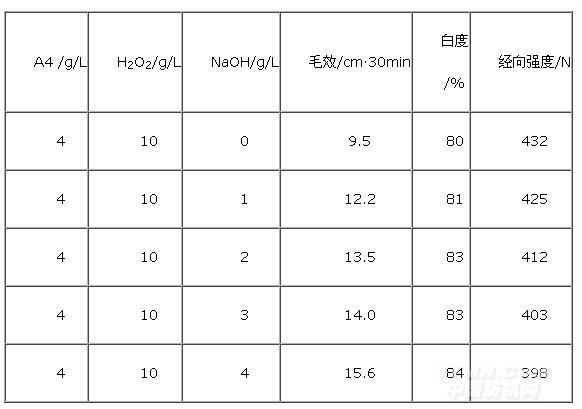 毛巾坯布上的蠟質、棉籽殼及各種漿料是影響毛效的主要因素,而燒堿的加入可以使織物上粘著的淀粉等漿料發生溶脹,便可容易洗去。下表是燒堿用量對毛效的影響。