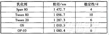 由表l可知,Tween80穩定性最好,10d未分層,且粒徑較小。由于OP—l0中含有APEO,對環境有影響,所以不選。