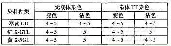 由表2可知,載體TT對染樣的色相影響不大。載體染色對色牢度的影響如表3所示。