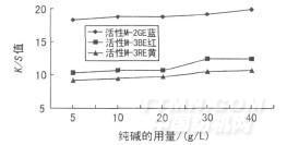 由圖2可知,活性紅M-3BE染色時,當純堿用量小于20g/L時,隨著純堿用量的增加,K/S值增加平緩;當純堿用量大于20g/L時,隨著純堿用量的增加,K/S值增加明顯;當純堿用量超過30g/L時,K/S值增加平緩?;钚渣SM-3RE和活性藍M-2GE染色時,當純堿用量小于20g/L時,隨著純堿用量的增加,K/S值增加較平緩;當純堿用量超過30g/L時,隨著純堿用量的增加,K/S值稍有上升。各種純堿用量下,染色紗線的表面均勻性均較好。綜合考慮,選擇純堿用量20~40g/L。