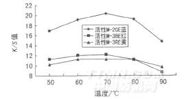 選用M型活性染料,改變染色溫度,按1.2.2節(jié)工藝染中深色,測定染色紗線的K/S值,結果見圖3。