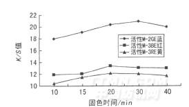 選用M型活性染料,改變固色時間,其對染色紗線的K/S值的影響見圖4。