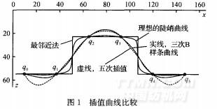 假設(shè)q(==O,1,…,5)為一組像素點(diǎn)的灰度值(即型值點(diǎn)),分別利用最鄰近法、線性插值法、五次拉格朗日插值法、三次B樣條插值法等方法求得插值曲線,如圖1所示。