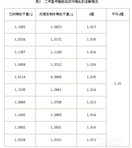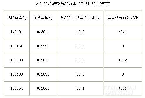 從表5來看,在不考慮20%鹽酸對(duì)氨綸的影響時(shí),按d值取1.00進(jìn)行計(jì)算,結(jié)果氨綸重量損失百分率在-0.1%~+0.2%之間。這說明20%鹽酸溶解錦綸時(shí)對(duì)氨綸基本沒有影響。