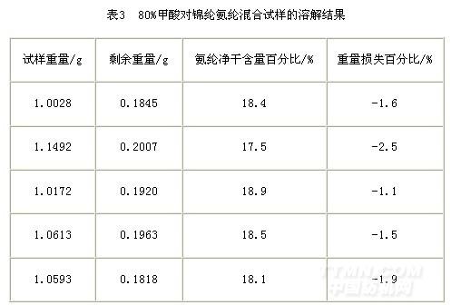 用80%甲酸溶解錦綸,剩余氨綸,使兩種纖維分離。將不溶纖維清洗、烘干、冷卻稱重,計(jì)算出各組分的含量百分率。