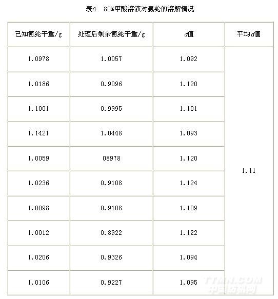 從表3來看,我們?cè)诓豢紤]80%甲酸對(duì)氨綸的影響時(shí),按d值取1.00進(jìn)行計(jì)算,結(jié)果氨綸重量損失百分率在-1.1%~-2.5%之間。這說明甲酸溶解氨綸時(shí)對(duì)錦綸的影響較大。