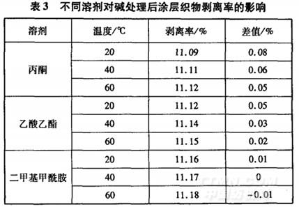 改性聚丙烯酸酯涂層織物經50g/LNaOH堿處理后,以蒸餾水作溶劑,經超聲清洗去除從基布分離的改性聚丙烯酸酯涂層,再選擇不同溶劑在不同溫度下處理試樣,結果見表3。