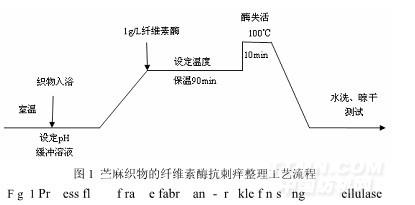 1.2.1 苧麻織物的纖維素酶整理實驗方法及工藝 為保證酶處理時纖維素酶處于最佳活力狀態(tài),先通過測定不同溫度和 pH 下所用纖維素酶的活力來了解和確定纖維素酶最佳活力條件。根據(jù)該纖維素酶供應(yīng)商的推薦以及本課題組對酶的最佳活力條件測定,確定酶的應(yīng)用 pH 為 4.5 左右,溫度為 55℃,重點優(yōu)化酶的使用 濃度和時間。在 55℃和 pH 4.5 下,設(shè)計酶處理濃度(0,0.25,0.5,0.75,1.0,1.25,1.5,1.75 %(o.w.f.)),酶處理時間(0,30,60,90,120,150min)的單因素試驗。苧麻織物的纖維 素酶抗刺癢整理的工藝流程如圖 1 所示