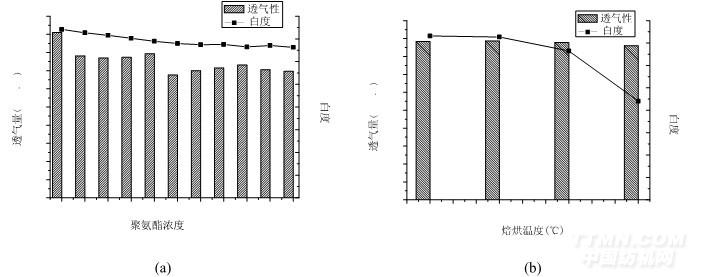苧麻織物的聚氨酯整理可能會對織物的透氣性和白度造成影響。苧麻織物白度和透氣性 能隨聚氨酯濃度增加和焙烘溫度提高的變化情況如圖 7 所示。