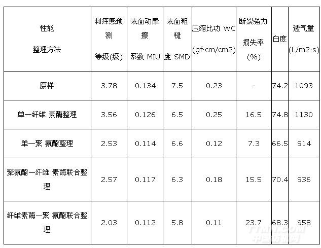 纖維素酶對苧麻纖維的水解作用有利于降低其剛性,改善苧麻織物手感和降低刺癢感, 但通常易使苧麻織物的強(qiáng)力損失嚴(yán)重,若輕度整理,則改善刺癢感的效果不明顯。聚氨酯整 理有利于包覆纖維毛羽頭端從而降低刺癢感,但是對降低纖維本身結(jié)晶度和剛性沒有作用。 為達(dá)到苧麻織物抗刺癢整理的綜合優(yōu)良效果,將以上兩種方法結(jié)合起來,揚長補短,發(fā)揮纖 維素酶整理和聚氨酯整理的優(yōu)點,彌補各自的不足。對比苧麻織物的纖維素酶、彈性聚氨酯 單獨整理及其聯(lián)合整理效果如表 7 所示。