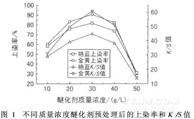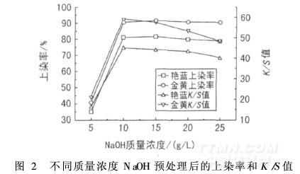 配制不同NaOH質(zhì)量濃度預(yù)處理液(浴比30∶1,醚化劑30 g/L),其它條件同上,染色后測(cè)定上染率和K/S值,見圖2。