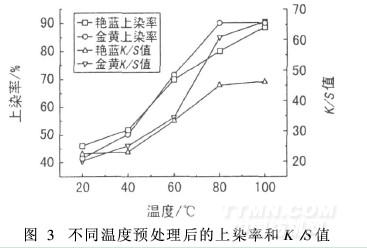 2.4 預(yù)處理溫度對(duì)上染率及K /S值的影響