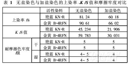 從表1可以看出,棉織物預(yù)處理后再進(jìn)行活性染料無鹽染色,上染率和K/S值明顯高于常規(guī)加鹽染色,干濕摩擦牢度略高于或相當(dāng)于加鹽染色。