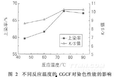 從圖2可知,隨著接枝反應(yīng)溫度的提高,染色織物的上染率、K/S值增大,提高接枝反應(yīng)溫度有利于獲得更好的染色效果。這是由于溫度高,殼聚糖分子擴(kuò)散快,大分子鏈熱運(yùn)動(dòng)加劇,分子能量提高;同時(shí),溫度高,殼聚糖溶液的黏度降低,這都有利于殼聚糖大分子與棉織物上的醛基接觸并向織物內(nèi)部滲透、擴(kuò)散。當(dāng)溫度超過75℃后,染色織物的上染率、K/S值變化不大。因此,合適的接枝反應(yīng)溫度為75℃。