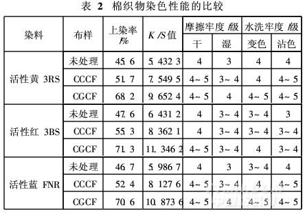 將醛基含量約為4. 3 mmol/g的氧化棉織物和未經(jīng)氧化處理的普通棉織物分別置于質(zhì)量分?jǐn)?shù)為1. 5%的殼聚糖溶液中, 75℃浸漬60 min,制得殼聚糖接枝氧化棉織物(CGCF)和殼聚糖涂覆棉織物(CCCF)。然后分別采用活性黃3RS、活性紅3BS和活性藍(lán)FNR染色,測(cè)試染色性能和染色牢度,并與未經(jīng)殼聚糖處理的棉織物進(jìn)行比較,結(jié)果見表2。