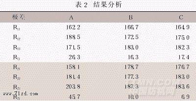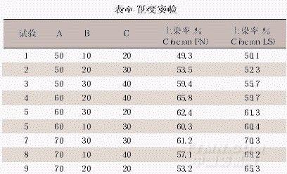 選用a上染溫度(℃),b上染時間(min),c元明粉(g/l),三因素四水平正交表l9(34)[10]安排實驗,用上染百分率評價染色效果,如表1所示。染料質量分數3%(對織物重),始染時,當升至染色溫度時將染料加入,將織物用熱水浸漬后擠干,放入染液,加入元明粉,然后續染至所需時間。固色使用na2co3 5g/l,時間40min,溫度80℃。