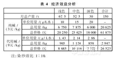 目前,市場上純堿的價格是3元/kg,代用堿的價格為9元/kg,根據一年來每月染色情況分析,淺中深顏色比例基本為:淺色45%,中色35%,深色20%,按每月150t生產量計算,使用純堿和代用堿的成本分析見表4。