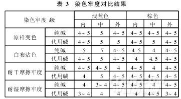 由表3可知,用新型堿劑EF-3代替純堿染色,色牢度都在規定范圍之內,符合要求。