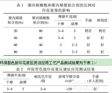 涂料色拔印花,其色牢度和鮮艷度與粘合劑的選擇關(guān)系很大.適用于涂料還原拔染印花漿的粘合劑比一般涂料直接印花要求更高:(1)必須為自交聯(lián)粘合劑(外交聯(lián)粘合劑不能用);(2)必須能耐還原劑(耐拔染劑);