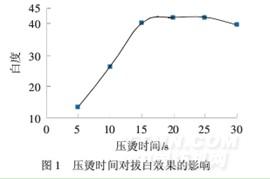 衣片(服裝)拔染印花,一般在印花后進(jìn)行壓燙熱處理或焙烘熱處理,試驗(yàn)了壓燙熱處理溫度為165℃條件下,時(shí)間對(duì)拔白效果的影響,結(jié)果如圖1.