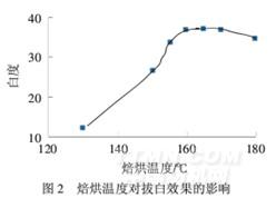 從圖1可以看出,壓燙時(shí)間為20 s時(shí),其白度最好,再延長(zhǎng)時(shí)間白度無(wú)提高.焙烘時(shí)間都為90 s,試驗(yàn)了焙烘拔白印花法熱處理溫度對(duì)拔白效果的影響.從圖2可以看出,溫度為160~165℃時(shí)白度最好,溫度過(guò)低,還原不充分,拔白效果較差,溫度過(guò)高,白度下降.其原因?yàn)?(1)活性染料還原破壞的色素在高溫時(shí)沾污到織物上;(2)棉纖維在濕熱狀態(tài)下泛黃.因此,焙烘法拔染印花,其溫度的控制很重要.