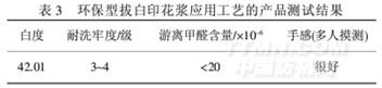 壓燙法的最好白度要比焙烘法的最好白度更好.因為織物上的還原拔染是在有水分的情況下,短時間、高濕下的還原反應,壓燙法比焙烘法能更好地保持還原過程中的水分.因此,壓燙法的拔白效果比焙烘法好,白度更白.測試了環(huán)保型拔白印花漿應用工藝的產(chǎn)品結(jié)果(見表3).