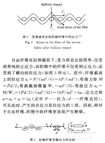 Roylance等'2。。指出,除了纖維的性能之外,織物的組織對材料的防彈性能同樣有著很大的影響。Karahan~等認為,對于機織物,由于交織的作用,紗線必定存在彎曲,當織物表面受到沖擊作用的時候,作用力就會產生水平方向以及垂直方向的分量F和F(如圖2所示),這會導致紗線之間相對滑移嚴重,產生更大創傷。