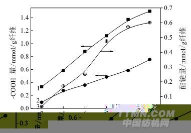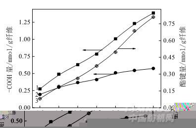 不同交聯時間下經 BTCA 交聯后粘膠纖維上總的參與酯化反應的羧基量、殘留的羧基量以及生成的酯鍵量的變化情況分別如圖 6 中曲線 1、2、3 所示。隨著交聯時間的延長,總的 參與酯化反應的羧基量逐漸增加,交聯后粘膠纖維中殘留的羧基量和生成的酯鍵量都是逐漸增加的。