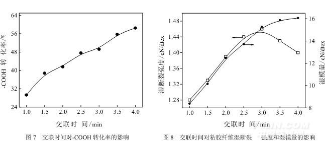 圖 8 為交聯時間對粘膠纖維濕斷裂強度和濕模量的影響。由圖可見,隨著交聯時間的延