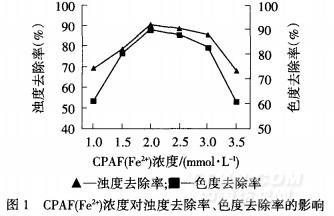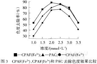 從圖3可以看出,隨著混凝劑濃度的增加,3種混凝劑的色度去除率均先上升后下降,且色度去除效果優(yōu)劣順序為CPAF(Fe)>PAC>CPAF(Fe3+).CPAF(Fe3+)在2.0mrnol/L時,色度去除率達(dá)最大(88.23%);而PAC和CPAF(Fe3+)在2.5mmol/L時才達(dá)到最佳,色度去除率分別為85.29%、76.47%.CPAF(Fe3+)的色度去除率較低,其可能原因是Fe3+的殘余色度比較大,而亞鐵的CPAF(Fe3+)混凝劑色度去除效果較好,解決了高鐵的CPAF(Fe3+)混凝劑殘余色度大的問題.