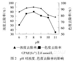 由圖2可見,隨著pH的變化,色度去除率的變化幅度明顯大于濁度去除率的變化.pH在7~9時,濁度去除率均較高(87%以上);pH在7~10時,色度去除率均較高(76%以上),其中pH=8時濁度去除率和色度去除率達(dá)到最高,分別為90.56%、85.29%;當(dāng)pH=11時,濁度去除率和色度去除率均不好.綜合考慮,最佳pH為7-10.對于實際印染廢水,大多數(shù)pH=9~10,故CPAF(Fe3+)對印染廢水的處理是非常有效的.