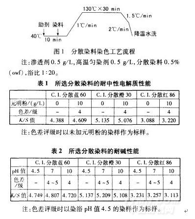 滌棉織物一浴法染色適宜染淺色,且以滌棉織物中棉纖維含量較少為宜,這樣活性染料的用量較小,浪費較少。若染較深的顏色,活性染料的固色率較低,既浪費了染料,又對污水處理不利。綜上所述,本試驗選擇約克夏公司的一套專用于滌棉織物一浴法染色的英彩克隆NRA活性染料,該系列染料含有多個活性基團,適合在溫度較高的條件下中性固色,上染率和固色率都比較好。