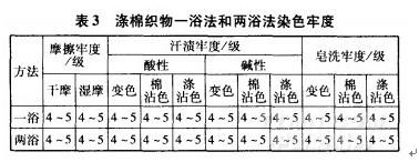 將滌棉織物用一浴法與兩浴法兩種工藝進行染色,測試兩種方法染色織物的色牢度,結果見表3。