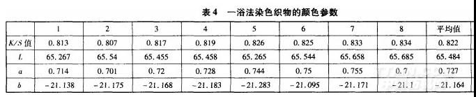 由表4可以看出,一浴法染色后滌棉織物K/S值和L,o,b值的標準偏差都比較小,說明勻染性較好。