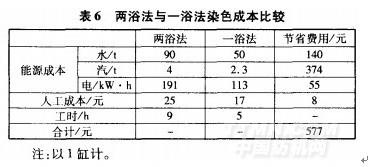 從能源、人工等方面分析滌棉織物兩浴法和一浴色的成本,結果見表6。