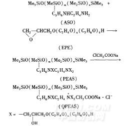 在裝有攪拌器、溫度計和回流冷凝管的250mL三頸瓶中,加人ASO 30g、EPE 12.15g和醇溶劑30%(占反應物的質(zhì)量分數(shù)),攪拌升溫至60~85℃,恒溫反應2~3h,得中間體PEAS。在該體系中繼續(xù)加入計量氯乙酸鈉,升溫至7O~90℃,反應4h,減壓蒸除溶劑及低沸物,得無色至淡黃色透明液體,即目標化合物QPEAS。