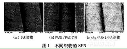 對PA織物、PANI/PA織物和Ag/PANI/PA織物進行電鏡掃描,比較其表面形貌,結果見圖1。
