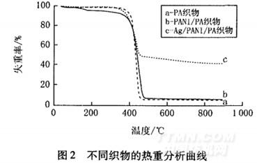 (2)由于化學鍍對PANI/PA織物的化學作用,催化了PA纖維的熱分解反應,導致Ag/PANI/PA織物的起始熱分解溫度下降。