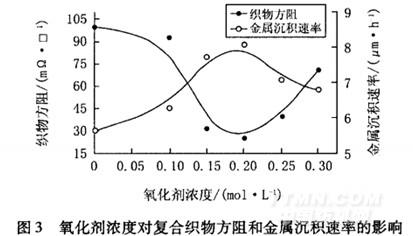 保持AniHC1:APS(摩爾分數比)為5:2不變,改變AniHCL濃度(0.1、0.3、0.5、0.7、0.9、1.1mol/L),制備方阻值分別為70.98、25.97、2.19、10.16、18.03、29.91kD./l-q的PANI/PA織物,并在相同條件下化學鍍銀,研究AniHC1濃度對復合織物方阻和金屬沉積速率的影響,結果見圖4。