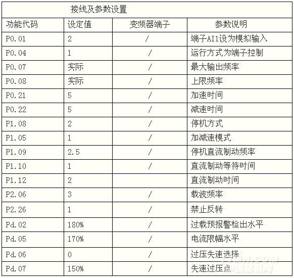在大圓機(jī)運(yùn)轉(zhuǎn)中,絕對(duì)不能讓電機(jī)反轉(zhuǎn)以及回轉(zhuǎn)現(xiàn)象,否則針床的針將被折彎甚至斷針。有些大圓機(jī)接入單向軸承,可不予考慮。要是系統(tǒng)正反轉(zhuǎn)完全取決于電機(jī)的正反轉(zhuǎn)控制,則需要設(shè)置合理的參數(shù),一方面要設(shè)置禁止反轉(zhuǎn)功能,另外一方面需要直流制動(dòng)功能。還要注意不能出現(xiàn)失速現(xiàn)象,以免造成斷針等損失。本方案采用模擬量輸入給定頻率。線(xiàn)路簡(jiǎn)單(省略)大圓機(jī)要求起動(dòng)時(shí)響應(yīng)要快,低頻大轉(zhuǎn)矩輸出;停機(jī)時(shí)要光滑、柔和一些,以保護(hù)針床。因此合理設(shè)置上表參數(shù)是充分發(fā)揮圓機(jī)性能的保證,原則是通過(guò)調(diào)解P0.19,P9.00參數(shù)得到最佳的低頻轉(zhuǎn)矩輸出能力以及降低圓機(jī)高速運(yùn)行的振動(dòng),通過(guò)調(diào)起??刂?P1組)以及加減速度時(shí)間參數(shù)(P0組)得到頻率調(diào)節(jié)的光滑性。