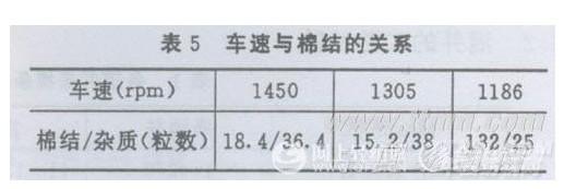 由于滌綸纖維的靜磨擦系數(shù)與動磨擦系數(shù)均高于純棉纖維0.1左右,我們認(rèn)為并條撤速高低對棉結(jié)粒數(shù)有一定的影響,以混一為例,我們做了三種車速的試驗(yàn)。見表5。