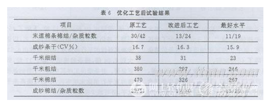 并條采取了上述三項(xiàng)工藝措施之后,棉條的棉結(jié)雜質(zhì)粒數(shù)下降了將近50%,成紗的千米棉結(jié)粒數(shù)下降了100粒。測試結(jié)果見表6。