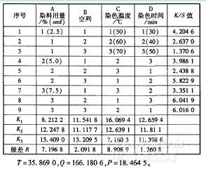 由表6方差分析可知,各個因素水平的不同,織物表面色深度(K/S值)差異不顯著。從表5可知,影響改性棉織物姜黃染料染色K/S值的3個因素的順序為:C>A>D,也即染色溫度影響最大,其次是染料質量分數,染色時間影響最小。其最佳組合為A3C1D1,即姜黃染料質量分數為7.5%(omf)、染色溫度5O℃、染色時間30min。