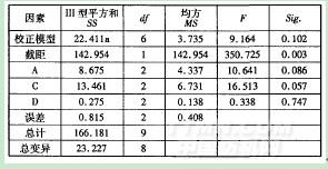 通過以上單因素優化試驗,即染料用量、染色溫度、染色時間、染色浴比對棉織物染色效果的影響,分別選取3個水平進行L9(34)正交試驗。以染色織物表面色深度(K/S值)為指標,正交試驗試驗方案及結果分析見表5。利用軟件PASWStatisitcs18對表5進行方差分析,結果見表6。
