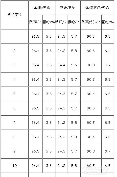 一般,拆紗法得到氨綸的含量的數(shù)值比較準(zhǔn)確,將拆紗的數(shù)值與次氯酸鈉法進(jìn)行比較,得到表2的數(shù)據(jù)。由表2可知,次氯酸鈉法與手工分解法絕對(duì)誤差遠(yuǎn)小于±1%。